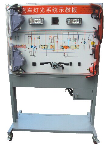 本产品选用原车灯光系统实物,展示汽车灯光系统的结构与原理;面板上绘有完整的灯光系统的电路图,设置有检测端子,可通过仪器仪表检测各种信号参数如电压、电阻、频率等。